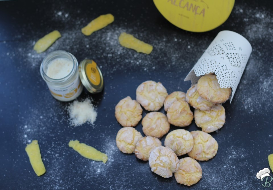 - 170 gramas de açúcar (adicionei um pouco de açúcar de limão Gourmarket) - 1 ovo - Casca de 1 limão (só a parte amarela) - Sumo de meio limão - 1 pitada de sal - 250 gramas de farinha - 1 colher de chá de fermento - Açúcar em pó q.b.
